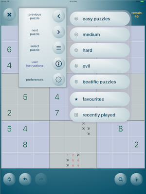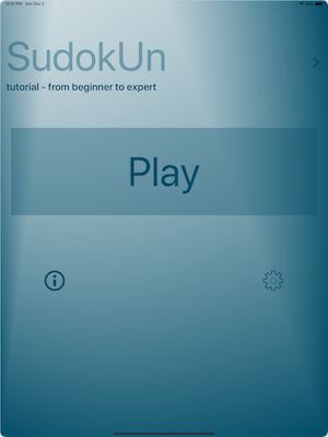 | The Entry View provides access to the tutorial and the user instructions documentation, lets you play the last played puzzle and access the preferences view | |||