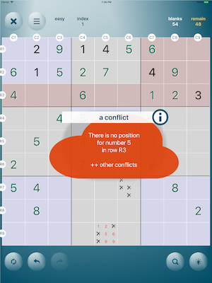| the Red Cloud button appears when the tips button is tapped and a conflict exists. It appears automatically when a conflicting selection is applied and the Error's Warning is set to AUTO in the Preferences View | the Conflict Cloud popup appears when the Red Cloud button is tapped. It hides when tapped |