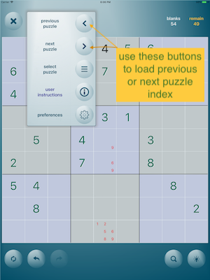 ![]() | The Level and Index indicators. Tapping anyone shows the Puzzle Selector locating the current game index | |